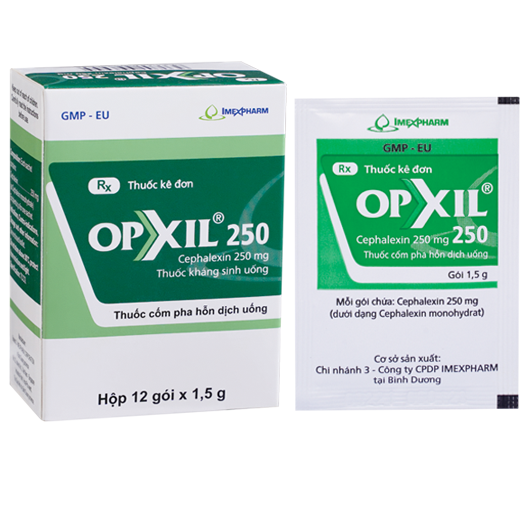 Sản xuất theo tiêu chuẩn EU-GMP. Mỗi gói chứa: Cephalexin (dưới dạng Cephalexin monohydrat) 250mg, Sachetlac 80, Tartrazin, Hydroxypropyl methylcellose, Aspartam, Bột mùi dâu, Bột mùi quả mâm xôi, Bột mùi tutti frutti, Colloidal anhydrous silica, Talc. Thuốc cốm pha hỗn dịch uống, khô tơi, có màu trắng ngà đến hơi vàng có mùi thơm. Hộp 12 gói x 1,5g